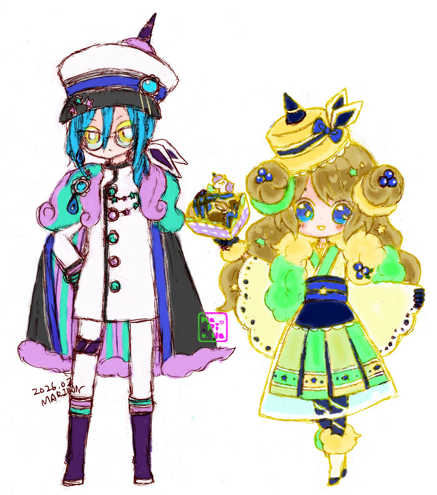 サウスが衣装案ラフで頭身とか画風のかんじとかなんも揃えてないし身長差も正確ではないのですが二人並んだところも見てもらえたら嬉しいので取り急ぎくっつけたやつも🫶